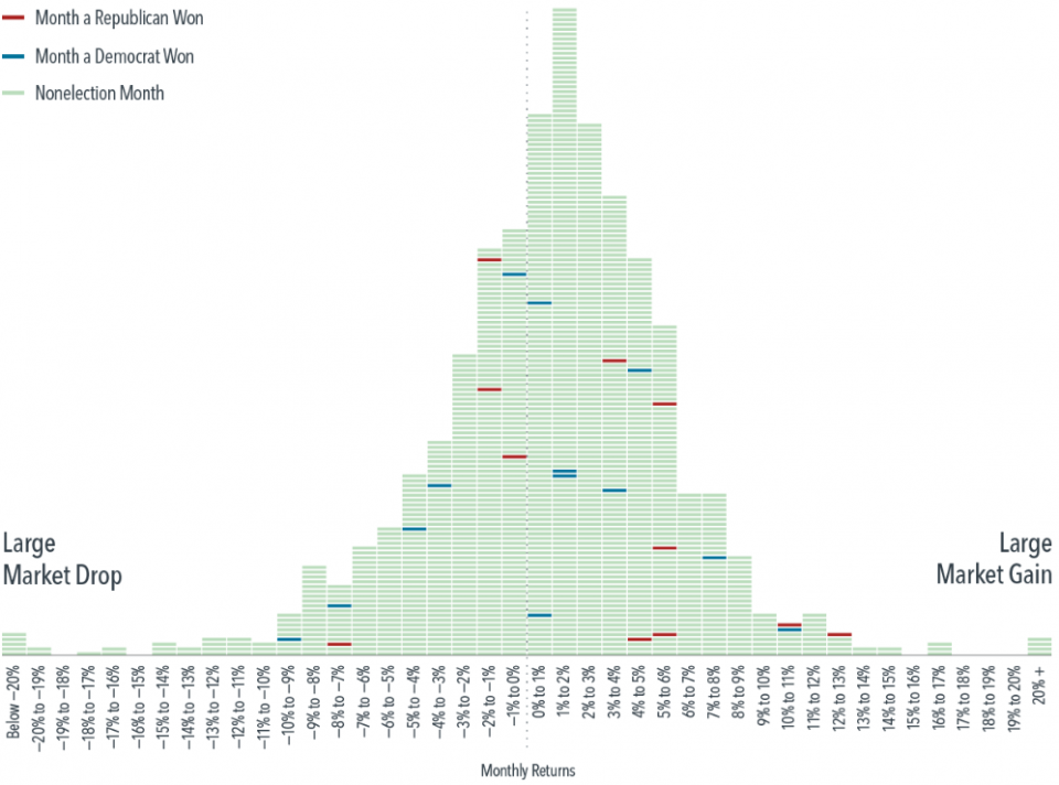 Furthermore, data for the stock market going back to 1926 shows that returns in months when presidential elections took place have not tended to be that different from returns in any other month. Exhibit 1 shows the frequency of monthly returns (expressed in 1% increments) for a broad-market index of US stocks from January 1926–December 2023. Each horizontal dash represents one month, and each vertical bar shows the cumulative number of months for which returns were within a given 1% range (e.g., the tallest bar shows all months in which returns were between 1% and 2%). The blue and red horizontal lines represent months during which a presidential election was held, with red meaning a Republican won the White House and blue representing the same for Democrats. This graphic illustrates that election month returns have been well dispersed throughout the range of outcomes, with no clear pattern based on which party won the presidency.